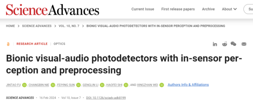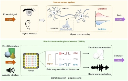 近日,我院微納制造與系統(tǒng)集成研究中心在Science開放獲取子刊Science Advances上,以“Bionic visual-audio photodetectors with in-sensor perception and preprocessing(可片上探測和預處理的仿生視聽光電探測器)”為題發(fā)表研究論文,提出了一種仿生“視聽”光電探測器,通過模擬人類感知系統(tǒng)中神經突觸間的“興奮”和“抑制”行為,在傳感端集成了“視聽”信號探測與預處理功能(圖1)。