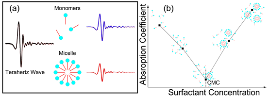 研究團(tuán)隊以典型兩親性分子為研究對象,利用太赫茲光譜技術(shù)分析了表面活性劑分子從單體到膠束變化過程中分子水化層的變化規(guī)律:低于臨界膠束濃度(CMC)時,溶液太赫茲吸收系數(shù)與濃度負(fù)相關(guān);高于CMC,溶液太赫茲吸收系數(shù)與濃度正相關(guān),并據(jù)此提出了一種利用太赫茲光譜技術(shù)無標(biāo)記檢測表面活性劑臨界膠束濃度(CMC)的方法。在酸溶液環(huán)境中,H3O+的增多使得液體環(huán)境中水合網(wǎng)絡(luò)增強而提高了溶液的吸收系數(shù),離子型表面活性劑CMC降低而非離子型表面活性劑CMC升高表明不同兩親性分子與水分子相互作用具有差異。