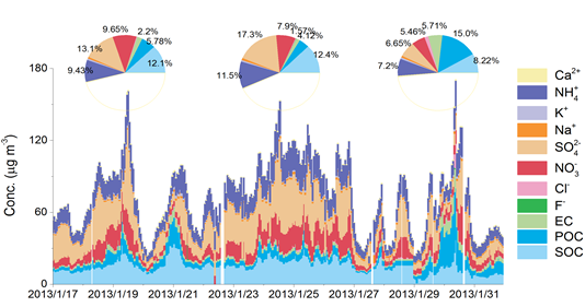 蘇州PM2.5水溶性離子和碳質(zhì)組分的時間序列變化圖;餅圖為三次霾污染事件中PM2.5的主要化學組成;POC和SOC分別代表一次有機碳和二次有機碳