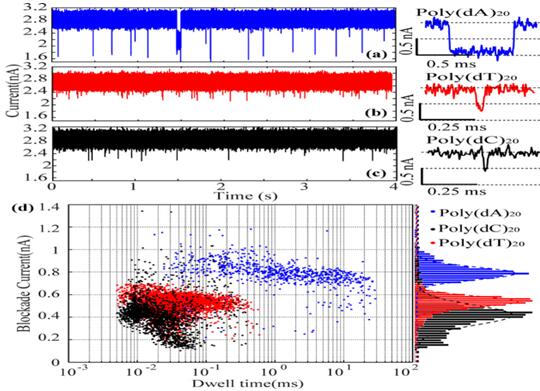 研究團(tuán)隊(duì)提出了一種簡單有效地電擊穿制備固態(tài)納米孔技術(shù),在20納米氮化硅薄膜上制備出圓錐形的3D納米通道,通過系統(tǒng)逐漸改變電流脈沖波形,實(shí)現(xiàn)納米通道圓錐角及納米通道大小的操控,制備出可應(yīng)用于生物傳感或者精確DNA測序的亞納米通道。研究結(jié)果表明,制備出的固態(tài)納米孔可以清晰地區(qū)分3種DNA均聚物(poly(dA)20、poly(dC)20和poly(dT)20)。