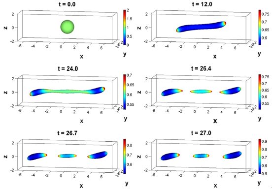 剪切流作用下表面活性劑覆蓋的液滴的分裂過程的模擬(顏色表示表面活性劑濃度)