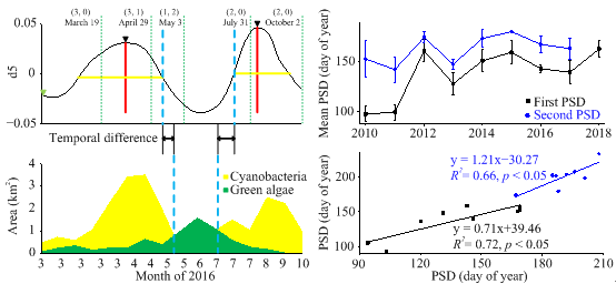 以小江(澎溪河)流域已建成的原位在線監(jiān)測系統(tǒng)為基礎(chǔ),研究團(tuán)隊(duì)利用環(huán)境一號衛(wèi)星CCD數(shù)據(jù)和實(shí)測地物光譜數(shù)據(jù),首先構(gòu)建葉綠素ɑ(浮游植物總生物量)與藻藍(lán)素(藍(lán)藻生物量)的反演模型,利用密度峰值聚類算法,實(shí)現(xiàn)藍(lán)藻水華區(qū)域自動聚類判別;其次,提出藍(lán)藻-綠藻分類光譜指數(shù),構(gòu)建兩類優(yōu)勢種水華的遙感識別模型,實(shí)現(xiàn)完整水文年藍(lán)藻-綠藻水華的時空信息提??;再次,利用小波峰度時序分析方法回溯近十年的遙感估測結(jié)果,從長時間尺度歸納藍(lán)藻-綠藻演替模式及潛在環(huán)境驅(qū)動因子。這一系列研究將遙感數(shù)據(jù)運(yùn)用于解譯藻華時空分布格局,將有助于對三峽庫區(qū)水華暴發(fā)過程的科學(xué)認(rèn)知與監(jiān)測預(yù)警。