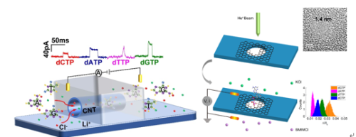 最近,在單核苷酸(DNA結(jié)構(gòu)單元)與納米孔相互作用行為與機(jī)制研究方面,重慶研究院團(tuán)隊(duì)和北京大學(xué)張錦院士團(tuán)隊(duì)合作,利用單根超長碳納米管,制備了碳納米管檢測芯片,成功識別了四種單核苷酸的特征電流信號,并揭示了碳納米管管徑與單核苷酸在其中傳輸行為的關(guān)系。相關(guān)工作以“Comparison Study on Single Nucleotides Transport Phenomena in Carbon Nanotubes”為題發(fā)表于Nano Letters。此外,研究人員還通過聚焦離子束直寫技術(shù),在單層石墨烯薄膜上成功實(shí)現(xiàn)亞2 nm納米孔的高精度制造,并結(jié)合室溫離子液體,研究了單核苷酸與單層碳原子的相互作用關(guān)系,首次實(shí)現(xiàn)石墨烯納米孔對單核苷酸類型的精準(zhǔn)識別(Sensors and Actuators B: Chemical 2021, 349, 130792)。