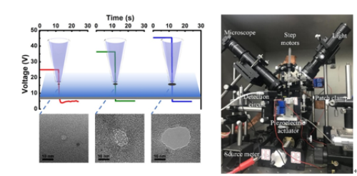 此外,為解決現(xiàn)有納米孔制備技術(shù)中加工成本高、陣列化制備難的工程技術(shù)難題,重慶研究院團(tuán)隊(duì)開發(fā)了新型納米孔制備技術(shù)和裝置,改進(jìn)了介電擊穿法施加電場的方式,基于納米操控技術(shù)控制納米針尖電場瞬時(shí)接觸納米薄膜,實(shí)現(xiàn)1—60 nm范圍內(nèi)固態(tài)納米孔的快速和可控制備。該裝置可加工納米孔單孔或納米孔陣列。(ACS Applied Bio Materials 2020, 3, 6368-6375 & Review of Scientific Instruments 2020, 91, 093203)。