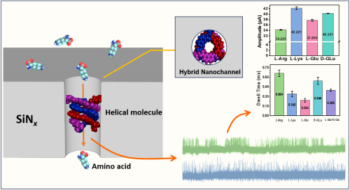 中科院重慶研究院精準(zhǔn)醫(yī)療中心與華中科技大學(xué)合作,構(gòu)建了新型有機(jī)/無(wú)機(jī)復(fù)合納米通道并用于單氨基酸及手性的鑒別。本工作設(shè)計(jì)的芳香酰胺手性分子能在溶液相中自發(fā)折疊成螺旋結(jié)構(gòu)通道,類氨基酸螺旋分子作為納米通道具有良好的離子傳輸選擇性和穩(wěn)定性,可媲美天然蛋白通道的性能。我們聯(lián)合無(wú)機(jī)氮化硅材料的物化穩(wěn)定性及有機(jī)螺旋手性分子的可設(shè)計(jì)及內(nèi)腔可調(diào)等性質(zhì),構(gòu)筑新型無(wú)脂質(zhì)支撐的小尺寸類蛋白復(fù)合手性納米通道,形成外表堅(jiān)固,內(nèi)表尺寸和表面性質(zhì)高度可重現(xiàn)的穩(wěn)定分析平臺(tái)。本文構(gòu)建的復(fù)合通道在不同離子溶液中表現(xiàn)出良好的離子傳輸性能,并實(shí)現(xiàn)了不同單氨基酸及氨基酸手性對(duì)映體的鑒別,呈現(xiàn)了具有亞納米級(jí)有機(jī)/無(wú)機(jī)雜化離子通道在單氨基酸水平上對(duì)肽和蛋白質(zhì)傳感的潛能,為復(fù)合固態(tài)納米通道測(cè)序應(yīng)用鋪平了道路。