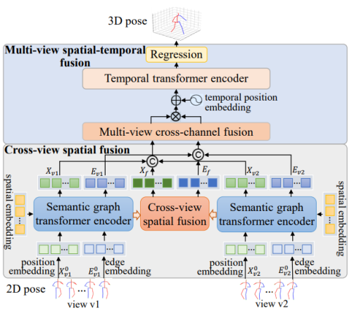 我院研究團(tuán)隊針對許多現(xiàn)有的多視角三維人體姿態(tài)估計方法存在忽略關(guān)節(jié)點多維度隱含信息、依賴特定場景的相機(jī)參數(shù)、語義特征挖掘不足等問題,研究了基于深度語義圖編碼器和基于漸進(jìn)性時空融合的多視角三維人體姿態(tài)估計方法。該研究通過提取描述人體關(guān)節(jié)點豐富空間結(jié)構(gòu)信息的語義圖嵌入特征,構(gòu)建實現(xiàn)不同特征間動態(tài)交互和融合的空間語義圖編碼器以及跨視角時空特征融合方法,充分挖掘不同視角關(guān)節(jié)點隱含的深層語義知識,增強姿態(tài)特征的表征性。