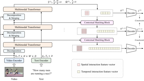 我院研究團(tuán)隊(duì)針對(duì)現(xiàn)有研究方法存在的上述問題,提出了一種高效的端到端視頻和語言聯(lián)合學(xué)習(xí)方法。該方法結(jié)合了現(xiàn)有研究中所驗(yàn)證的局部空間信息和時(shí)間動(dòng)態(tài)特性對(duì)于提升問答推理準(zhǔn)確性的幫助,通過設(shè)計(jì)金字塔式視頻和語言交互結(jié)構(gòu),將視頻分解成具有不同粒度的空間和時(shí)間特征,并堆疊多個(gè)多模態(tài) Transformer層提取其與問題之間的交互,實(shí)現(xiàn)了視頻和文本之間的局部和全局依賴關(guān)系提取。此外,為更充分地利用各層上的局部和全局交互特征,該方法設(shè)計(jì)了一種基于上下文匹配的橫向連接操作以及多步損失約束,以逐步地實(shí)現(xiàn)局部和全局語義完整的交互特征的提取。