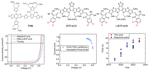 光電轉(zhuǎn)化效率是衡量光伏電池性能的第一指標(biāo)。近年來(lái),有機(jī)光伏電池的效率通過(guò)不斷的材料創(chuàng)新和器件優(yōu)化取得了突飛猛進(jìn)的發(fā)展。但是相較于晶硅光伏電池、鈣鈦礦光伏電池等,有機(jī)光伏電池的效率還存在差距。為提升有機(jī)光伏電池效率,需要降低光伏電池的能量損失同時(shí)改善有機(jī)薄膜形貌,以此獲得更高的開(kāi)路電壓。在此方面,通過(guò)源頭上材料端的合理設(shè)計(jì),誘導(dǎo)活性層更優(yōu)的相形貌分離,進(jìn)而降低能量損失,以此提升光伏電池效率是最優(yōu)方案,也是最有挑戰(zhàn)的策略之一。重慶研究院與香港理工大學(xué)等合作,通過(guò)合理設(shè)計(jì)篩選材料分子片段,構(gòu)建高效的有機(jī)光伏材料分子,實(shí)現(xiàn)給受體材料結(jié)晶性、互溶性、能級(jí)、吸收光譜、相分離等多維度匹配,獲得了光電轉(zhuǎn)化效率19.9%的有機(jī)光伏電池,相關(guān)工作以“Rational molecular and device design enables organic solar cells approaching 20% efficiency”為題發(fā)表于《自然通訊》(Nature Commun. 2024, 15, 1830)。