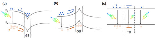 晶界是影響鈣鈦礦、碲化鎘、銅銦鎵硒等薄膜光伏性能的重要因素。晶體的長(zhǎng)程有序性在晶界處中斷,后續(xù)加工過(guò)程中晶界與晶粒摻雜不均,使得晶界能從大塊材料中捕獲載流子,產(chǎn)生局部電荷、局域能態(tài)。局域能態(tài)造成能帶彎曲,最終晶界表現(xiàn)出與晶粒內(nèi)部截然不同的電學(xué)行為,影響多晶薄膜光電轉(zhuǎn)換效率。一方面晶界作為重組位點(diǎn)捕獲載流子,另一方面晶界與晶粒之間的能帶彎曲,有益于載流子的分離,晶界對(duì)薄膜光伏光電轉(zhuǎn)化效率的有益性還是有害性仍存在爭(zhēng)論。重慶研究院研究人員從載流子動(dòng)力學(xué)的角度,介紹晶界電學(xué)行為從理論推導(dǎo)到實(shí)驗(yàn)觀測(cè)發(fā)展歷程,并對(duì)晶界電學(xué)行為進(jìn)行分類(lèi),闡述了載流子在偏壓,光照等外加條件情況下的運(yùn)動(dòng)狀態(tài),及晶界能帶變化,揭示了通過(guò)鈍化等處理手段調(diào)整晶界元素等對(duì)薄膜光伏電池的影響。相關(guān)工作以“The Electrical Behaviors of Grain Boundaries in Polycrystalline Optoelectronic Materials”為題發(fā)表于《先進(jìn)材料》 (Adv. Mater. 2024, 36, 2304855)。