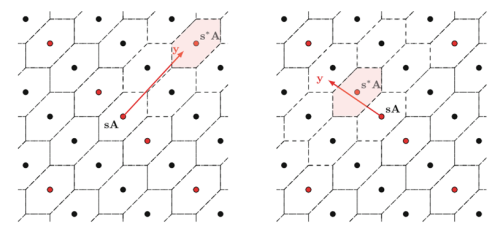 圖 1離y最近的格點(diǎn)情況:紅點(diǎn)在 S 中。左側(cè)面板顯示距離 y 最近點(diǎn)在 S 上,但右側(cè)面板清楚地顯示距離 y 最近點(diǎn)不在 S 上。