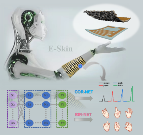 近日,中國科學(xué)院重慶綠色智能技術(shù)研究院機(jī)器人技術(shù)與系統(tǒng)中心在《Nano Energy》期刊發(fā)表了題為“Leather-Based Printed Tactile Sensor Array for Robotic Interactive Skin”的論文。該研究發(fā)展了一種新型的皮革基微結(jié)構(gòu)表面絲網(wǎng)印刷技術(shù),制備出具有垂直梯度導(dǎo)電纖維網(wǎng)絡(luò)的陣列式電子皮膚。這種獨特的多層分級導(dǎo)電纖維網(wǎng)絡(luò)力敏結(jié)構(gòu),允許傳感器在較寬的壓力范圍(0-4.5 MPa)內(nèi)仍保持高線性度(99.30%)和高一致性(99.98%)。還具有快速響應(yīng)時間(10 ms)、快速恢復(fù)時間(<10 ms)、優(yōu)良的穩(wěn)定性(~7500循環(huán))和穩(wěn)定的動態(tài)響應(yīng)性能。同時,其優(yōu)異的柔韌性使該觸覺皮革器件更好地共形貼裝于機(jī)器人體表。此外,使用了Tet-Net卷積神經(jīng)網(wǎng)絡(luò)作為骨干網(wǎng)絡(luò),結(jié)合深度可分離卷積、多尺度特征提取模塊、非對稱卷積塊等,建立了接觸物體識別殘差網(wǎng)絡(luò)(COR-Net)和基于注意力機(jī)制的交互手勢識別殘差網(wǎng)絡(luò) (IGR-Net) ,成功識別了接觸不同物體的硬度材質(zhì)用于碰撞預(yù)警,以及判斷人手交互意圖,準(zhǔn)確率分別為95%和98.48%,機(jī)器人可以根據(jù)人的交互意圖完成物體抓取和搬運等操作。該項研究證實了電子皮膚技術(shù)可大大提升機(jī)器人人機(jī)交互的安全性和自然性。