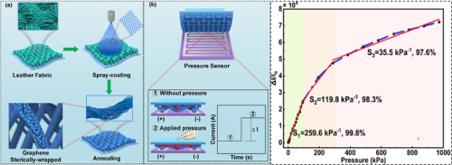 噴涂構(gòu)筑微納共形力敏結(jié)構(gòu),制備大量程高靈敏度柔性傳感器。針對(duì)柔性傳感器微納力敏界面難以可控制備致使器件靈敏度與量程不可兼得的技術(shù)瓶頸,團(tuán)隊(duì)基于低成本、高效可控的霧化噴涂工藝,提出微納共形力敏結(jié)構(gòu)的噴涂制備新方法,發(fā)展力敏導(dǎo)電層在三維微納結(jié)構(gòu)表面的大面積可控沉積技術(shù),實(shí)現(xiàn)了MPa級(jí)大量程高靈敏度柔性傳感器的可控制備,顯著降低了對(duì)高端微納加工設(shè)備的依賴與制造成本,具備良好的工藝可擴(kuò)展性與大面陣潛力,并適配多種柔性基材與異形曲面。相關(guān)成果以“Graphene sterically-wrapped textile piezoresistive sensors: A spray coating path for synergistically advancing sensitivity and response range”為題發(fā)表在《Chemical Engineering Journal》。