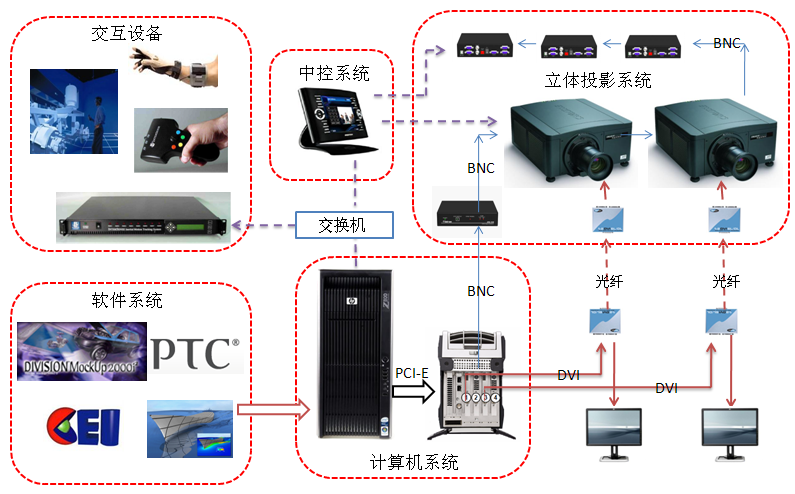 投影顯示系統(tǒng)由兩臺CHRISTIE(科視)投影儀、視頻信號光纖傳輸裝置、立體眼鏡及立體信號發(fā)射器組成,為系統(tǒng)提供虛擬仿真成像,人機(jī)交互等技術(shù)支持,三維立體仿真演示功能并具備沉浸效果(3D電子樣機(jī)顯示功能)。計(jì)算機(jī)系由15臺Z400圖形工作站、1臺Z800圖形工作站及Q7000外置圖形卡、畫中畫數(shù)據(jù)采集卡等組成,為系統(tǒng)提供強(qiáng)大的數(shù)據(jù)及圖形處理能力;交互系統(tǒng)主要由IS-900超聲波空間定位系統(tǒng)組成,可通過空間鼠標(biāo)、數(shù)據(jù)手套等設(shè)備進(jìn)行人機(jī)交互,實(shí)現(xiàn)對數(shù)據(jù)的全沉浸式訪問。