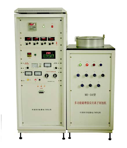ME-3A型多功能機既可作反應離子刻蝕(RIE),又可作磁增強反應離子刻蝕(MERIE),且轉(zhuǎn)換十分方便(只需撥一下開關(guān)),由于有磁場的作用,它在較高真空度(< 1Pa)下亦可起輝并穩(wěn)定工作,因此,它不僅可用于常規(guī)的半導體干法刻蝕,還特別適用于亞微米和邊沿陡直圖形的刻蝕,使用不同的氣體,它可刻蝕Si3N4、SiO2、磷硅玻璃、Si、poly-Si、W、WSi、Mo、石英、鈮、正、負光刻膠、聚乙酰亞胺等材料。該機型具有六路進氣入口(其中二路用于氣路清洗),采用4個質(zhì)量流量計控制氣流流量,因此重復性好,可自動控時。另外,該機預抽真空的時間很短(3~5分鐘),工作效率高,操作簡單。